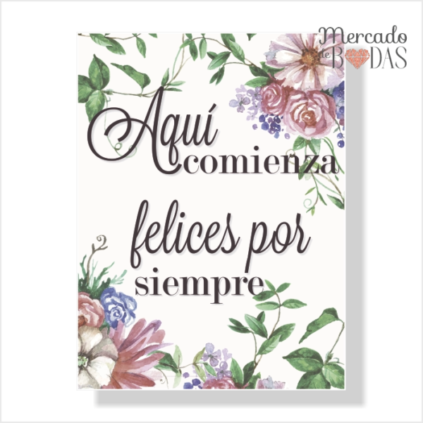 Cartel para boda pequeño “Aquí comienza felices por siempre.”